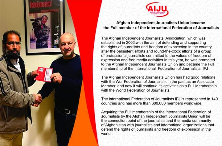 Acquiring the Full membership of the international Federation of Journalists by the Afghan Independent Journalists Union will be the connection point of the journalists and the media community of Afghanistan with journalists and international organizations that defend the rights of journalists and freedom of expression in the world.
